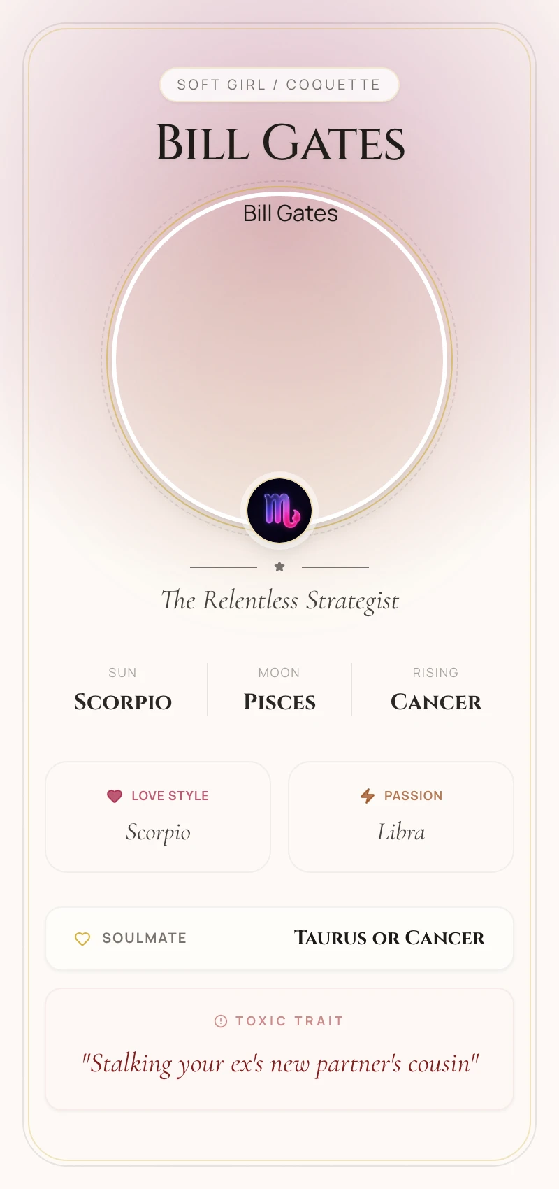 As a quintessential Scorpio, Bill Gates's life has been defined by power, strategy, and transformation. His Scorpio Sun fueled the obsessive focus and all-or-nothing ambition required to dominate the personal computer industry. This placement explains his legendary competitiveness and his ability to see the hidden levers of power in business. His later-life pivot from CEO to philanthropist is a classic Scorpio rebirth, transforming his immense resources into a new kind of power aimed at solving the world's most intractable problems.
