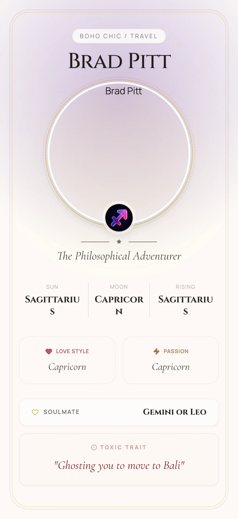 The app overlays your chart with Brad Pitt's — every planet, every house. See exactly where you align and where you differ.