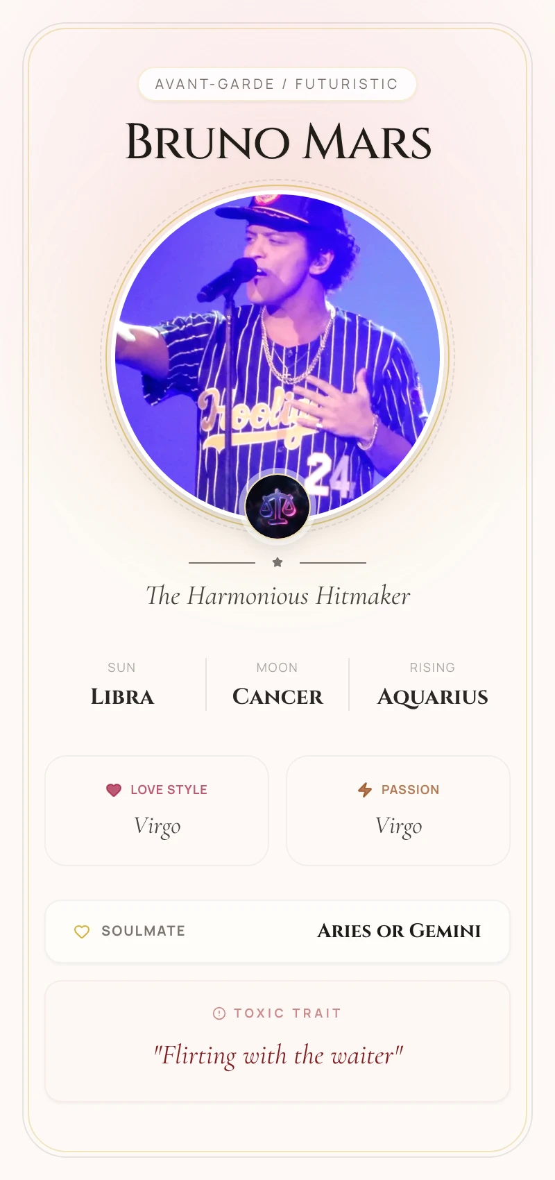 Bruno's Sun in Libra, the sign of balance, art, and partnership, is the core of his musical genius. Ruled by Venus, this placement explains his knack for creating perfectly structured pop songs, his smooth romantic appeal, and his incredible success in collaborations like Silk Sonic. His meticulous attention to aesthetic detail, from his polished choreography to his retro-inspired fashion, is pure Libra energy, always striving for beauty and harmony.