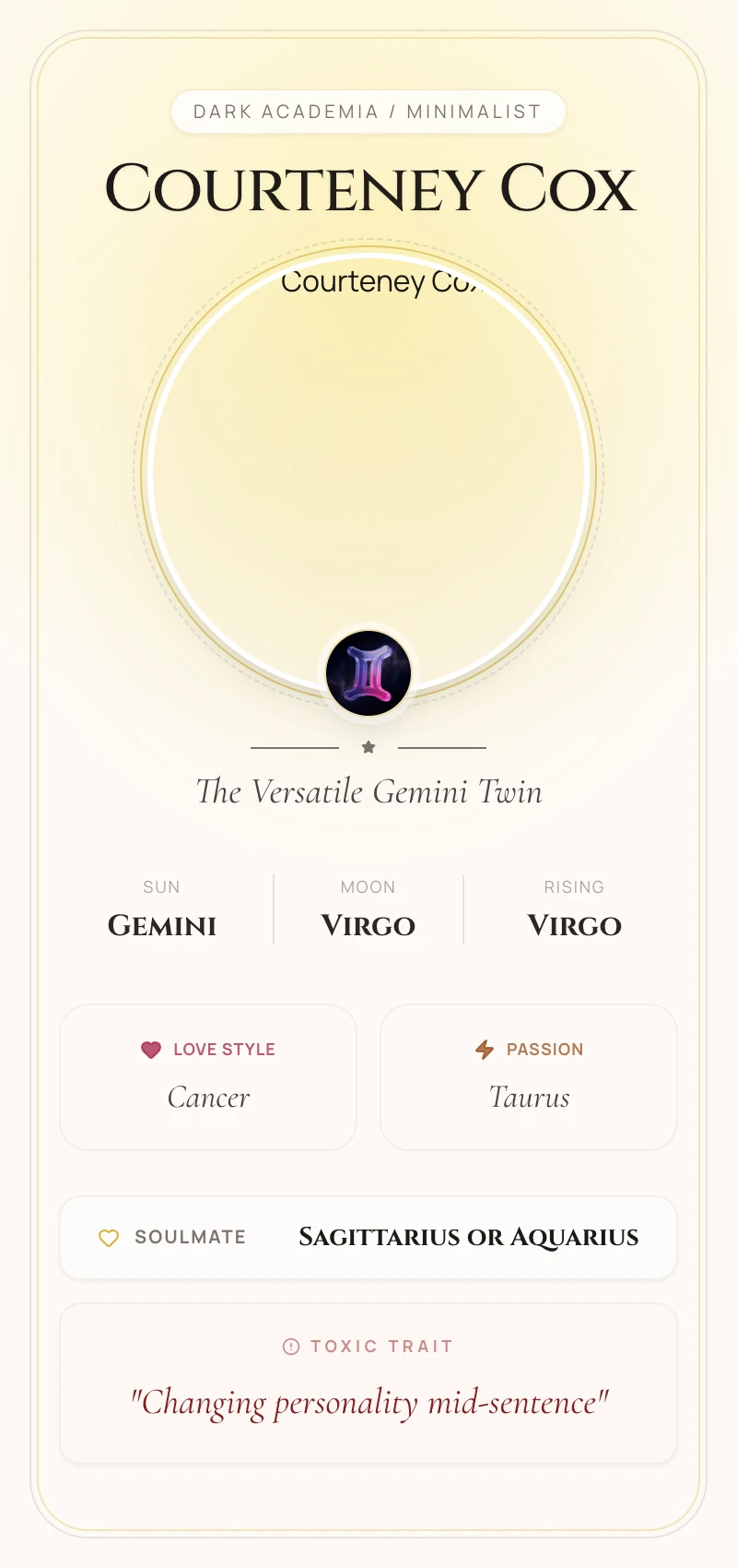 Courteney's Gemini Sun is the source of her incredible versatility and sharp wit. This air sign energy allows her to effortlessly pivot between genres, from the lightning-fast comedic timing required for 'Friends' to the thrilling suspense of the 'Scream' franchise. Gemini is the sign of the communicator, and Cox's career is built on her mastery of dialogue, her intellectual curiosity, and her ability to mentally adapt to any role, making her eternally relevant.