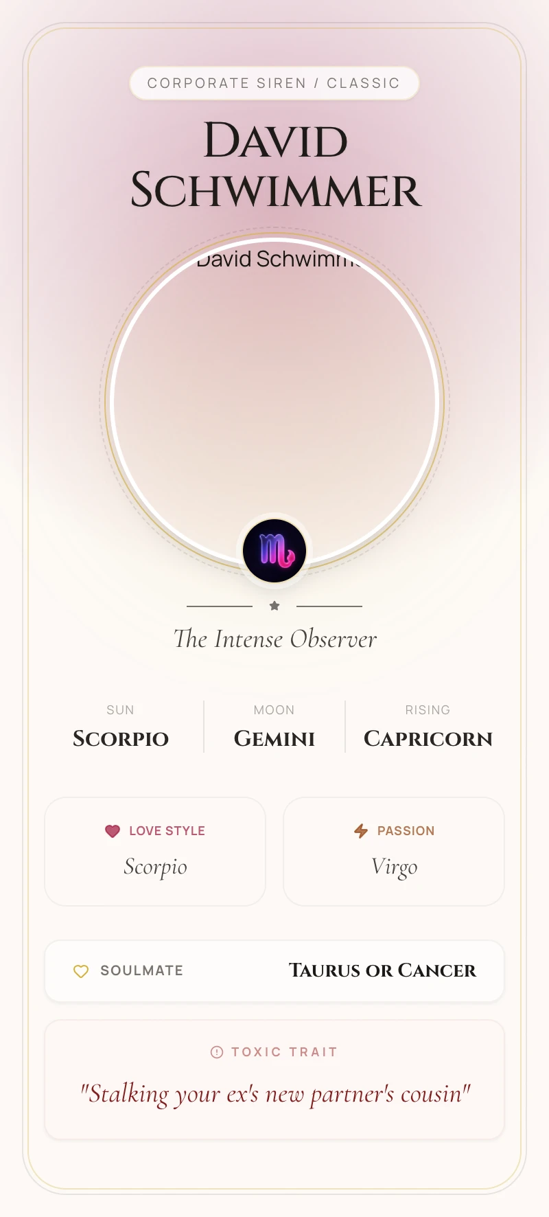 The app overlays your chart with David Schwimmer's — every planet, every house. See exactly where you align and where you differ.
