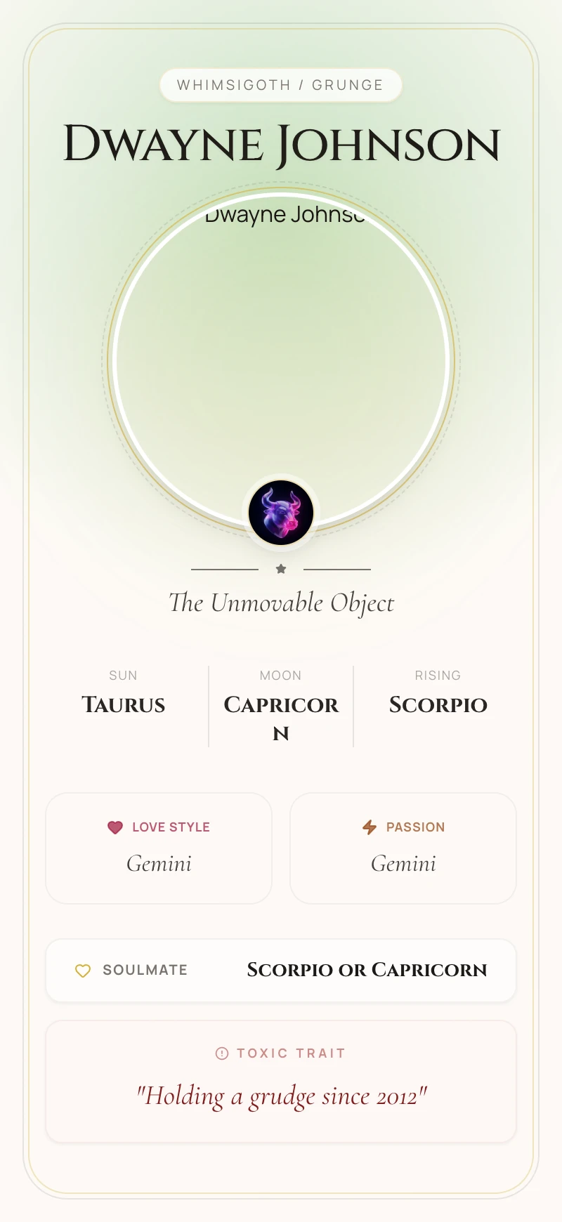 With his Sun in earthy Taurus, Johnson embodies the archetype of the builder. This placement provides the legendary stamina behind his 'Iron Paradise' workouts and the patient business acumen required to build Teremana Tequila into a record-breaking brand. Like a true Taurus, he values tangible results, consistency, and being the 'hardest worker in the room.'