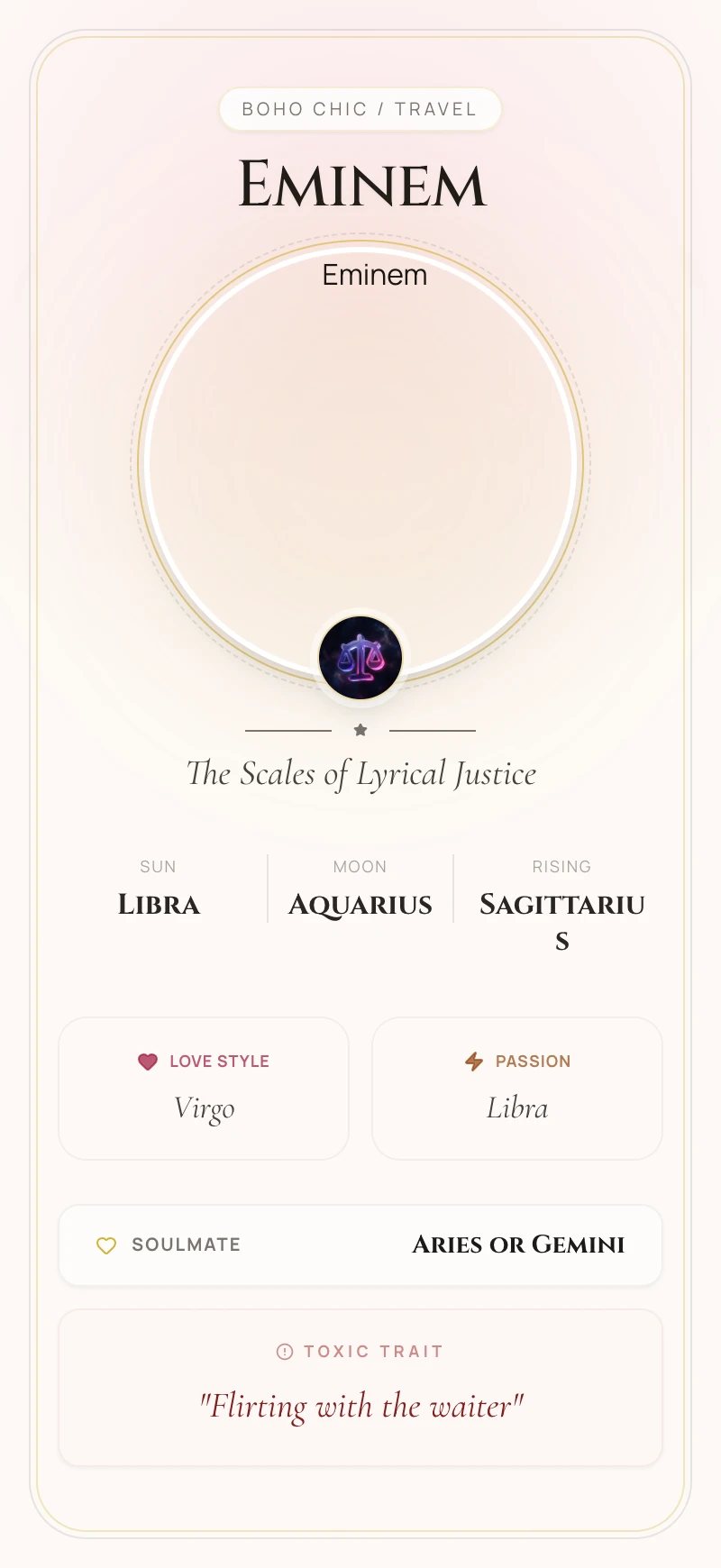 As a Libra, Eminem is driven by a deep sense of justice and balance, a theme that underpins his entire career. While seemingly paradoxical for a battle rapper, his lyrics often function as a public court, weighing injustices and calling out hypocrisy with razor-sharp precision. This Libran energy fuels his masterful wordplay and complex rhyme schemes, seeking a perfect, artistic harmony amidst chaos. His famous feuds are rarely random; they are his way of rebalancing the scales against a perceived wrong.