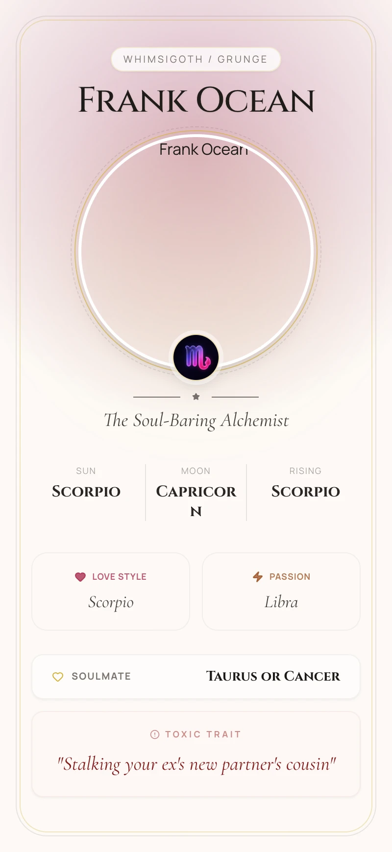 The app overlays your chart with Frank Ocean's — every planet, every house. See exactly where you align and where you differ.