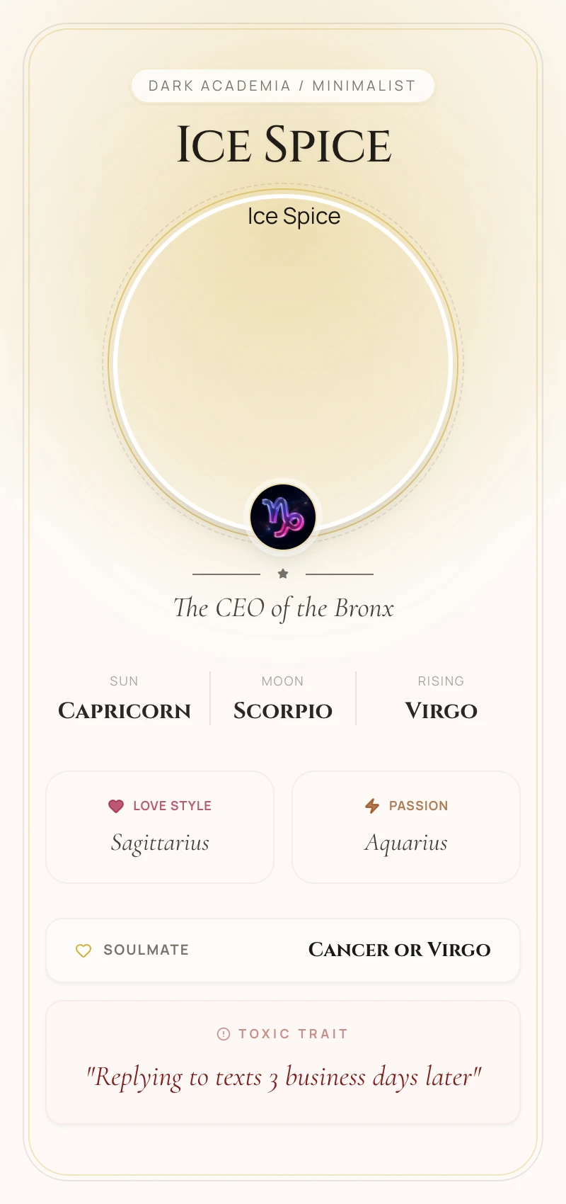 Ice Spice’s Capricorn Sun is the silent engine behind her meteoric rise. This earthy, ambitious sign is the zodiac's master strategist, which explains how she masterfully converted viral moments into a sustainable career. Her deadpan delivery, unshakable focus, and strategic collaborations with icons like Nicki Minaj and Taylor Swift are pure Capricorn—building an empire with discipline, patience, and an innate understanding of the long game.
