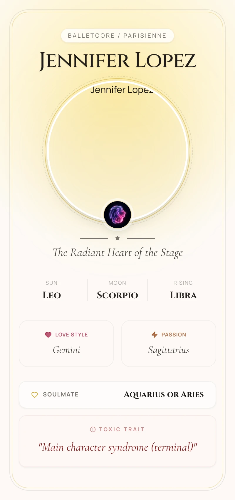 The app overlays your chart with Jennifer Lopez's — every planet, every house. See exactly where you align and where you differ.