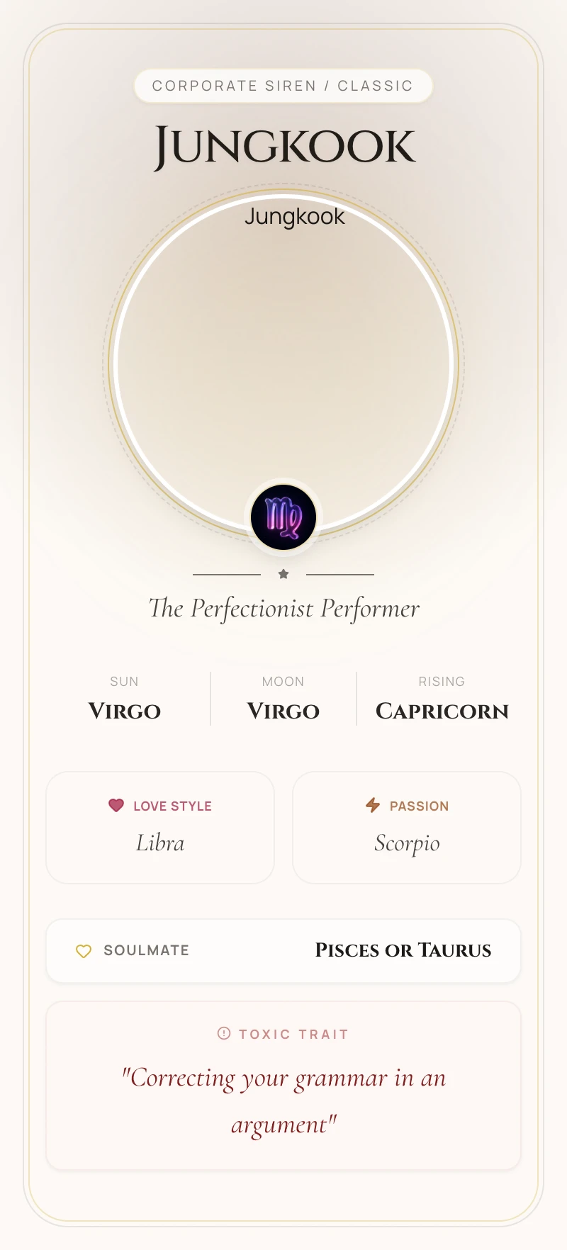 Jungkook's first impression is filtered through a disciplined Capricorn Ascendant. This placement explains his initially shy and reserved demeanor in BTS's early years, which slowly gave way to a powerful and respected public persona. Ruled by Saturn, this rising sign provides the ambition, resilience, and quiet determination to build a lasting legacy. It's the astrological foundation for his incredible career trajectory, showcasing an old soul's wisdom and an unwavering focus on his goals.