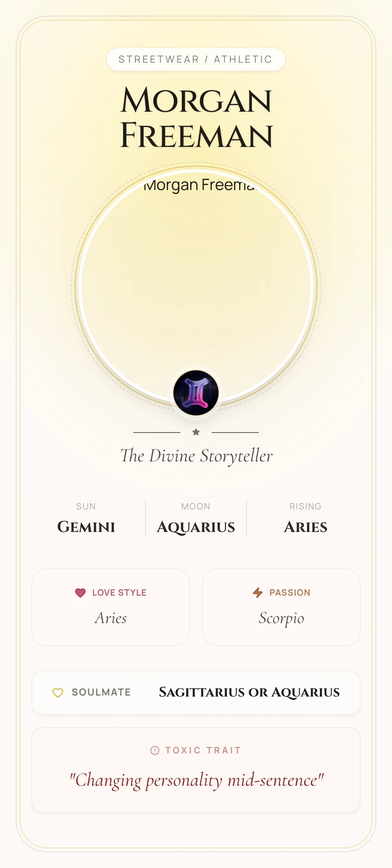 Morgan Freeman's Sun in Gemini, the sign of communication, is the celestial source of his greatest gift: his voice. This placement blessed him with an innate mastery of language, rhythm, and narrative. It explains his incredible versatility, allowing him to effortlessly shift from a wise inmate in 'The Shawshank Redemption' to the literal voice of God in 'Bruce Almighty'. His Gemini curiosity fuels his passion for narration, turning documentaries like 'March of the Penguins' into captivating cinematic experiences.