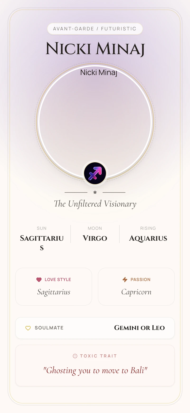 The app overlays your chart with Nicki Minaj's — every planet, every house. See exactly where you align and where you differ.