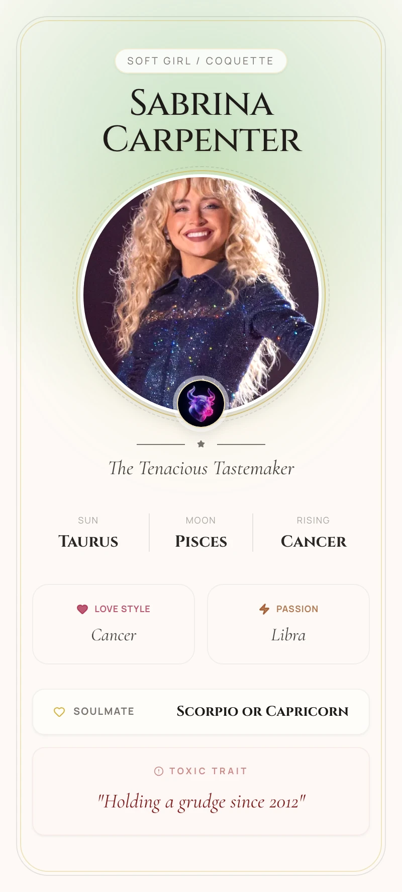 From Disney actress to global pop phenomenon, Sabrina Carpenter's meteoric rise is fueled by the ambition of her Taurus Sun. Beneath the confident stage presence lies the dreamy, emotional depth of a Pisces Moon and the approachable charm of a Cancer Ascendant, creating the ultimate relatable superstar.