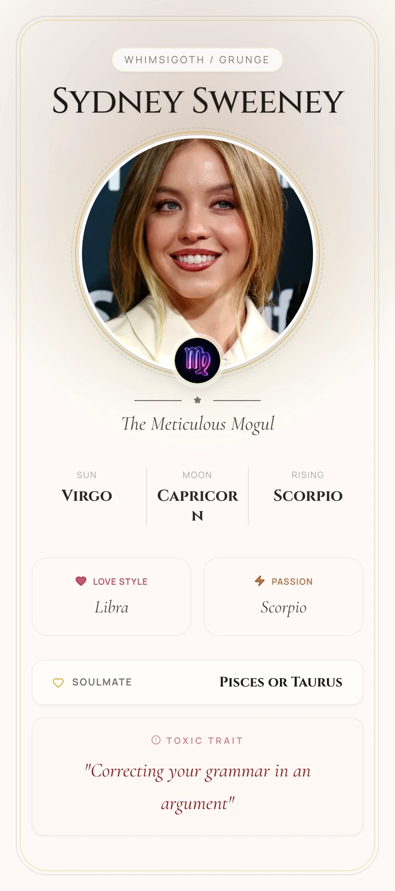 Known for her captivating performances in 'Euphoria' and 'The White Lotus', Sydney Sweeney has strategically built a powerful Hollywood career. Her chart reveals a potent blend of a meticulous Virgo Sun, an ambitious Capricorn Moon, and a magnetic Scorpio Ascendant, making her a formidable and enigmatic force in the industry.