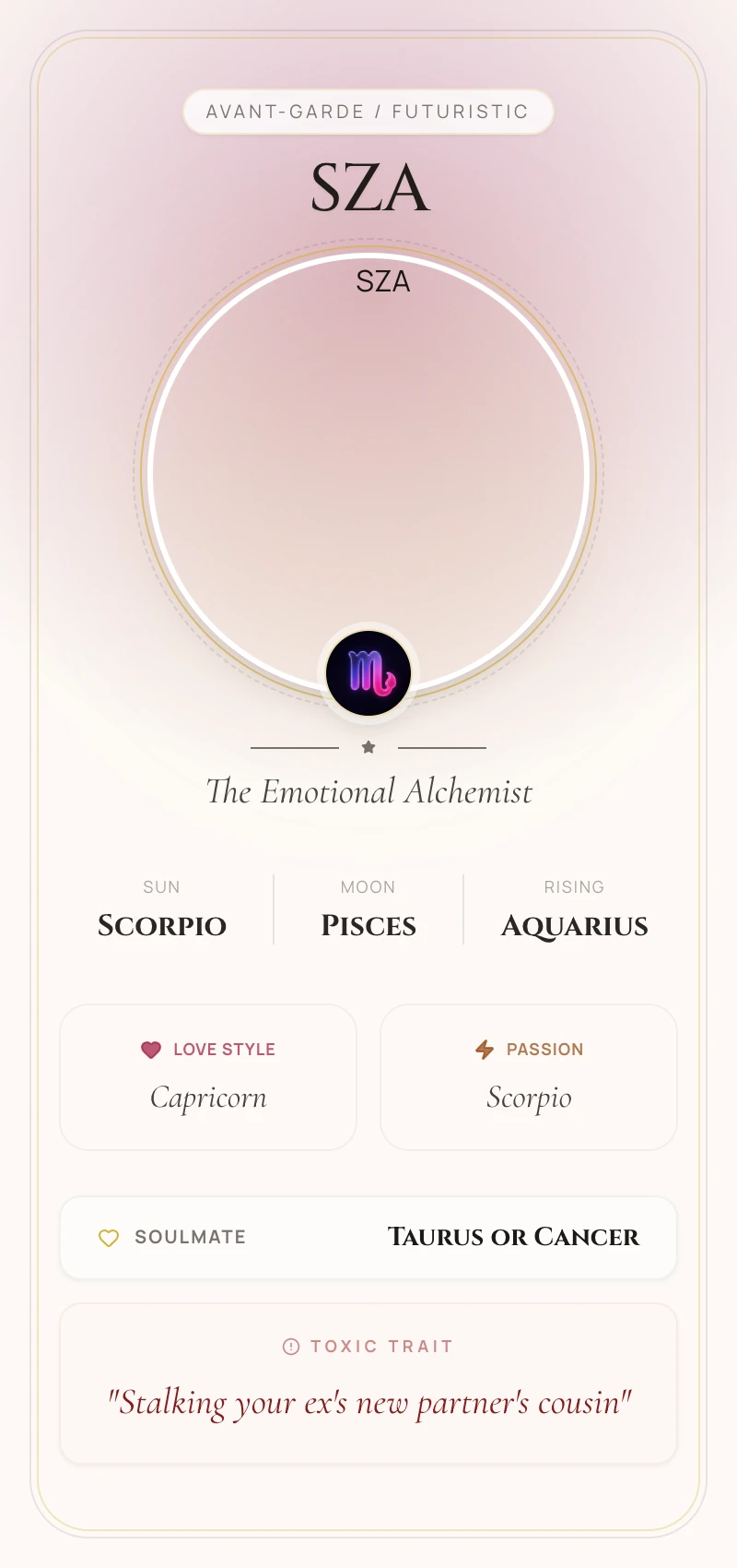 SZA's Scorpio Sun is the raw, beating heart of her artistry. This placement bestows an unshakeable need to dive into the emotional depths, transforming pain, obsession, and jealousy into powerful, cathartic anthems like 'Kill Bill.' She doesn't just write about feelings; she performs an alchemical process, turning the darkness of human connection into pure, relatable gold.