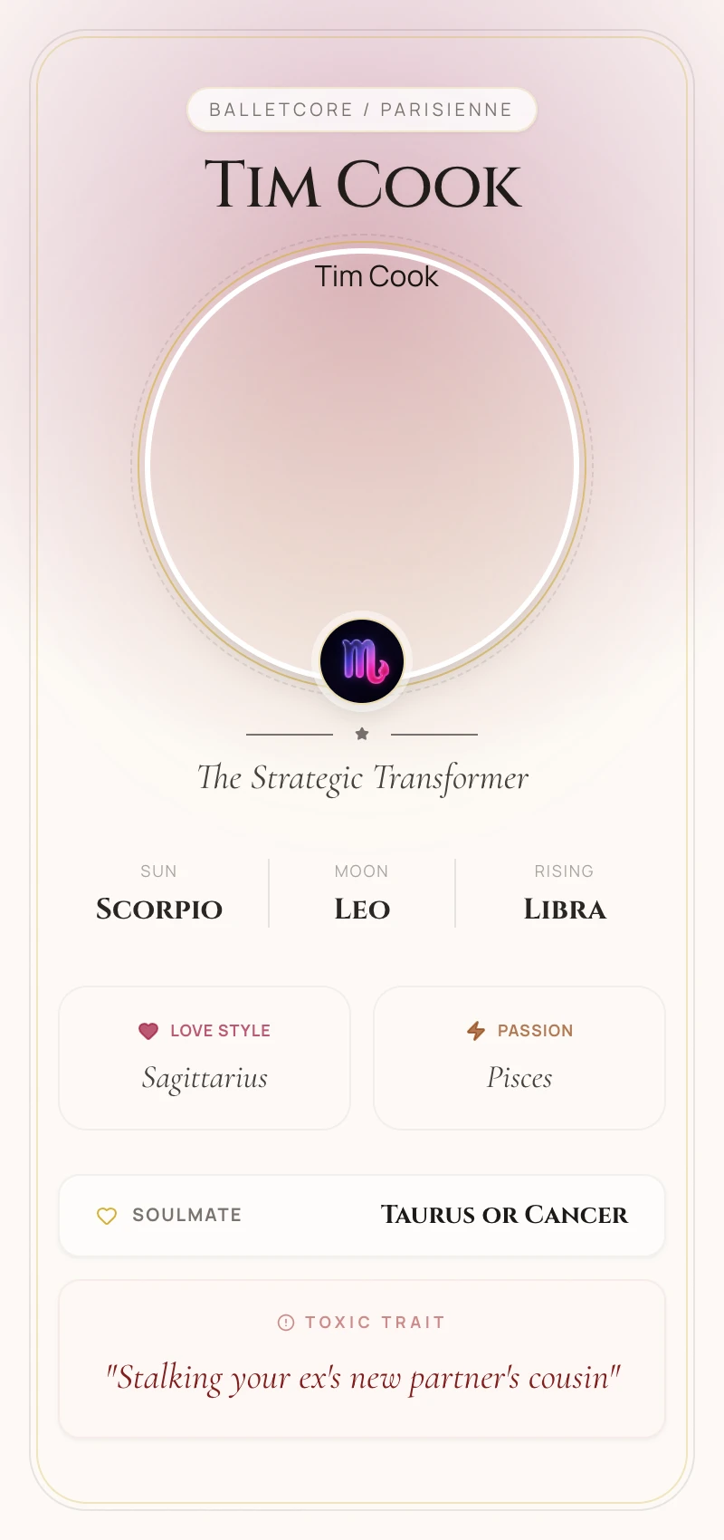 His Libra Ascendant is the calm, balanced, and diplomatic interface he presents to the world. This is why his public persona is so measured, gracious, and seemingly unflappable, especially when navigating congressional hearings or complex international relations. The Libra Rising provides a crucial social grace that softens the Scorpio intensity, allowing him to build consensus and architect one of the most complex global supply chains in history. It's the velvet glove over the Scorpionic iron fist.