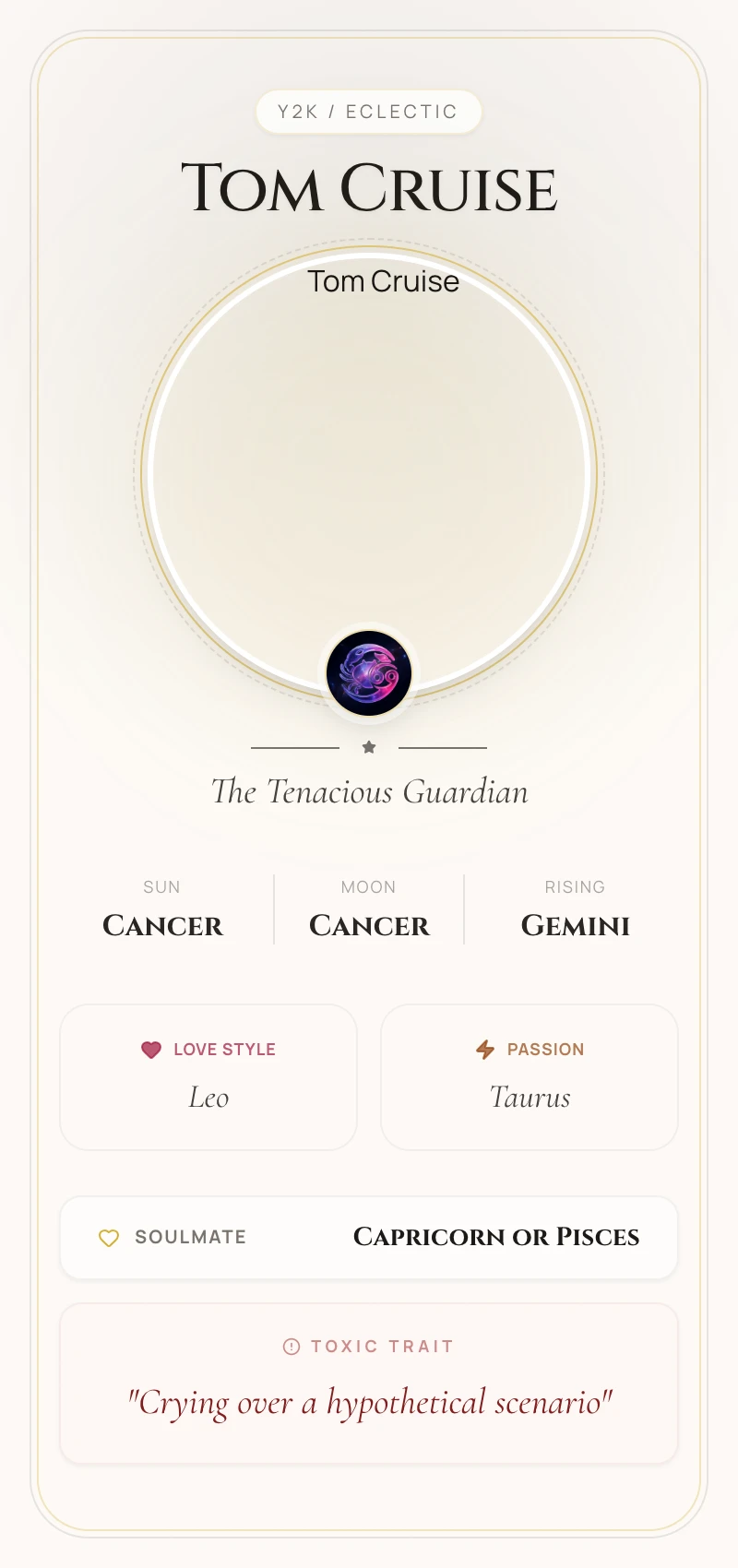 Tom Cruise’s Moon in Cancer reveals a profound emotional depth and an unyielding need for security and belonging, powerfully shaping his iconic career. This placement manifests in his unwavering loyalty to filmmaking, often creating a familial atmosphere on set and meticulously cultivating the cinematic experience for his audience, much like a Cancerian nesting instinct. His legendary dedication to practical stunts and delivering a perfect product stems from a deep, emotional investment in protecting the integrity of his craft and ensuring a 'safe,' authentic experience. While intensely private, his commitment to his chosen community (Scientology) reflects a powerful drive to find security and belonging, ultimately fueling the relentless, protective hero persona he embodies both on and off screen.