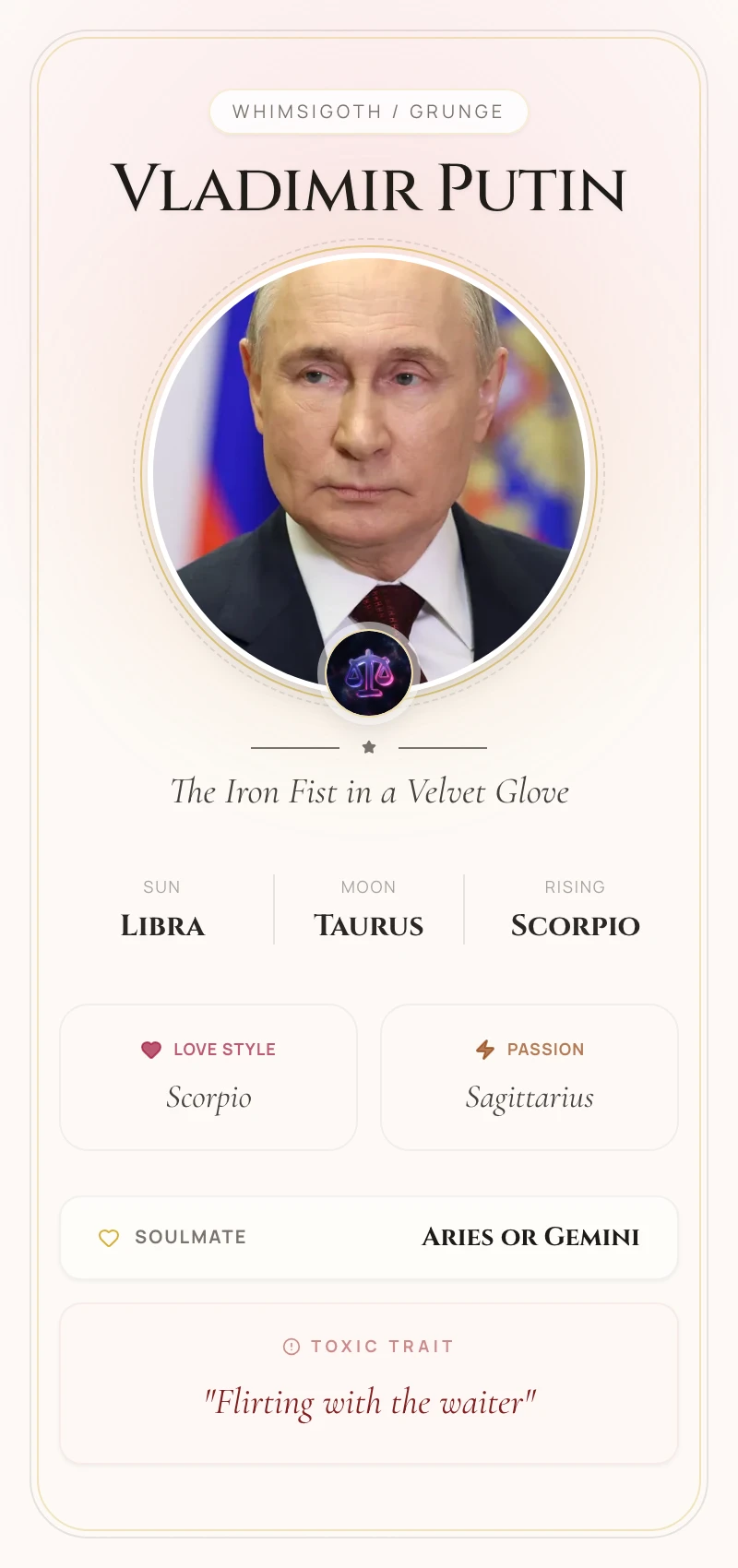 While Libra is the sign of peace and diplomacy, Putin's Sun manifests as a master strategist, constantly weighing options and seeking leverage. His public persona is often calm and charmingly reasonable, a classic Libra trait used to mask an iron will. This is the energy of a master negotiator who understands the power of appearances and legal frameworks, perfectly embodied by his background in law and his expertise in judo—an art form centered on using an opponent's balance to achieve victory.