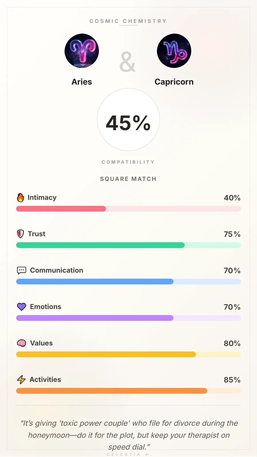 Aries and Capricorn have a 45% overall compatibility score, with their strongest connection in Shared Activities (85%) and their biggest challenge in Intimacy (40%).